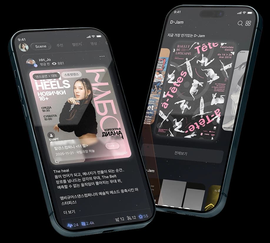 우리는 단순한 커뮤니티를 넘어 내가 원하는 댄스 이벤트를 발견하고 참여하며, 댄스 시장 구성원 모두가 성장하는 공간을 만들려 합니다. 이번 리뉴얼에서는 참여 중심의 ‘D-Jam’ 기능과 보다 자유로운 소통이 가능한 ‘Scene’, 나만의 댄스 히스토리를 담은 ‘Dance ID’ 기능으로 여러분의 경험을 새롭게 디자인합니다.